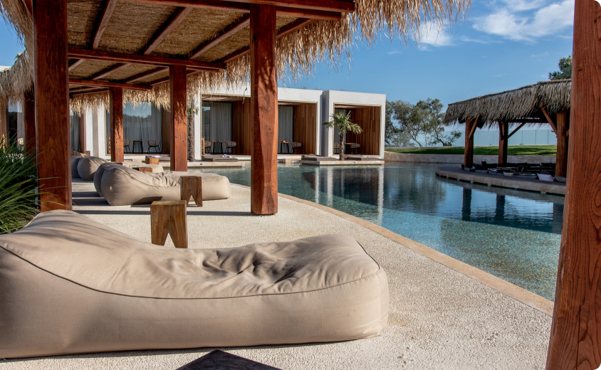 Our open air swimming pool is located near the sea with its beautiful view. Water of the pool is blue and clean to make refreshing mind and body.